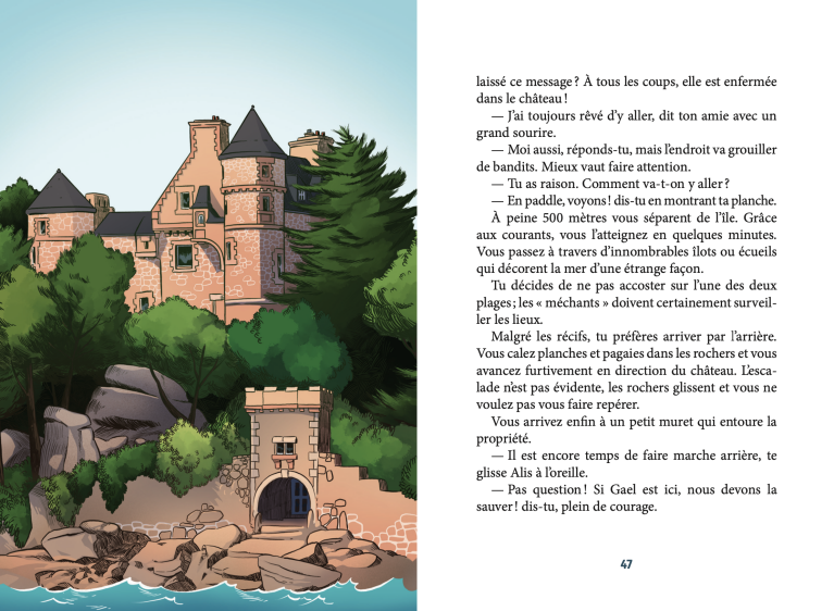 Aux côtés d’Alis, sur la plage de Ploumanac’h, vous attendez Gael, ta deuxième meilleure amie, pour une session de paddle. Mais celle-ci est très en retard et ne répond à aucun de tes textos. Inquiets, vous voyez soudain un attrou- pement se former autour du kiosque de granit qui abrite la statue de saint Guirec. Une pancarte y est accrochée, avec un message qui vous est destiné : Gael a été kidnappée ! Vous partez aus- sitôt mener l’enquête et parcourir la côte de Granit rose à sa recherche.